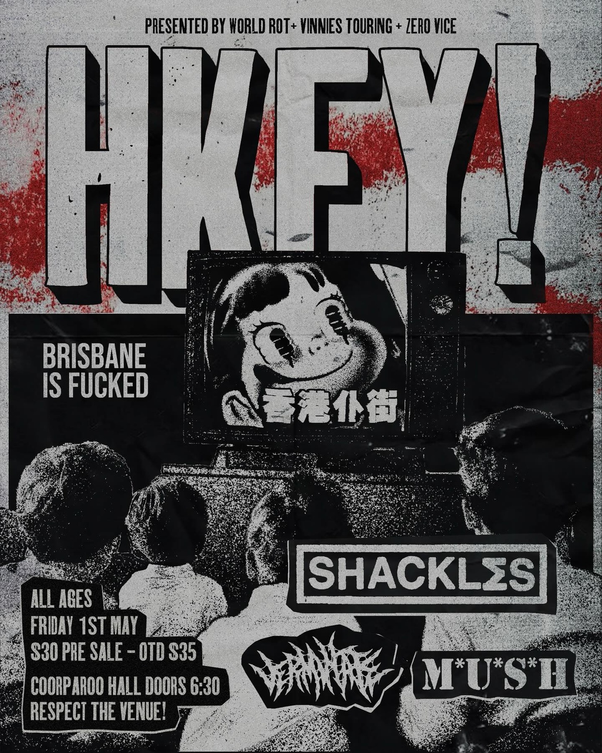 HONG KONG FUCK YOU are coming to FUCK Down Under. Hailing from Mexico/USA, the low-IQ champions bring their unhinged blend of industrial noise, punk, and powerviolence to the East Coast of Australia. Fuelled by the chaos of three bass players and a drummer.