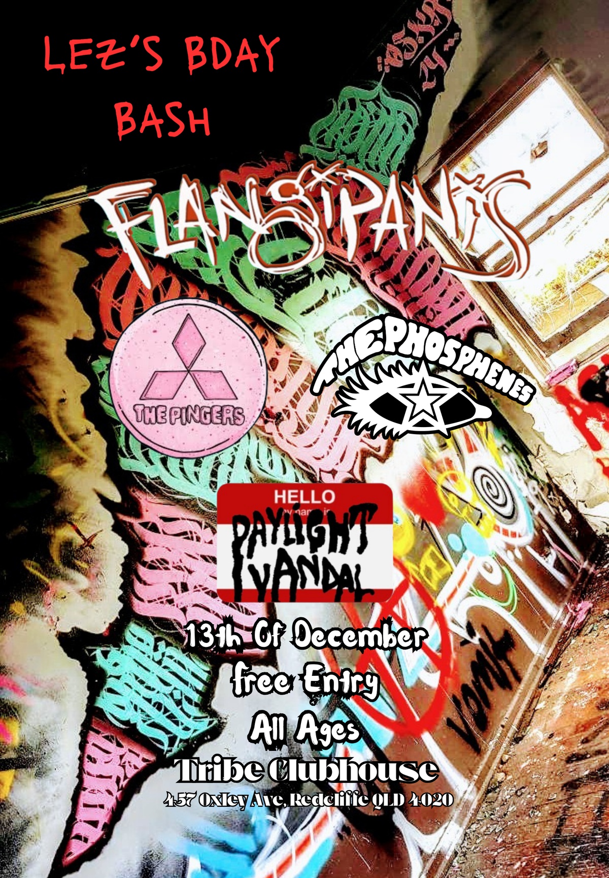 Celebrating we have the amazing bands daylight vandal, the phosphenes, the pingers from the snowy mountains and our amazing headliner flangipanis, free entry and all ages