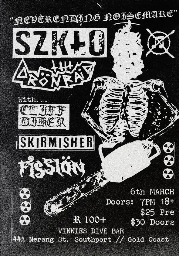 Szklo an Drönraid are playing Vinnies dive bar a aspart of their Queensland tour. Joined by Cliff Biker, Skirmisher, and Fission.