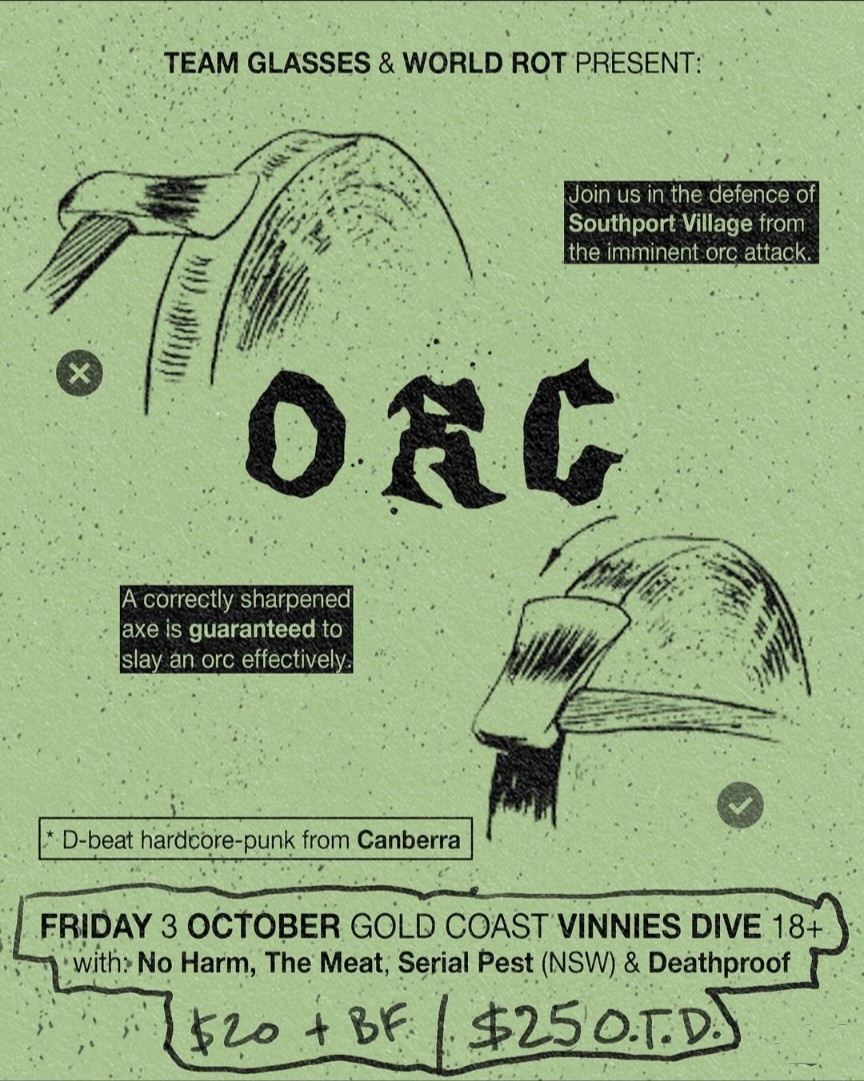 Canberra's ORC will be finally bringing their d-beat hardcore assault to Southport. To defend these lands, Brisbane hardcore punks NO HARM and THE MEAT will travel south to fend off the assault. Eora punx SERIAL PEST will also rush into battle with local riff lords DEATHPROOF holding the front line.