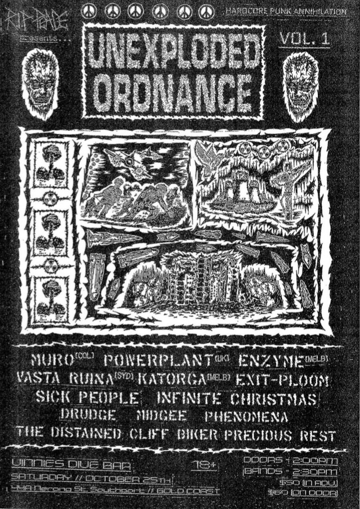 Stoked to announce the following which’ll be running in collaborative unison with the upcoming MURO [Columbia] and POWERPLANT [UK] Australian tours brought to you by Hardcore Victim // and Blow Blood // respectively. A new festival oriented initiative from yours truly that is UNEXPLODED ORDNANCE. This year, bringing you a range of local/domestic/international hardcore punk and adjacent sonic genres together for total annihilation on Saturday, October 25th down on the Gold Coast at Vinnies Dive Bar. 14 bands will play across 2 stages with doors at 2PM and bands from 2:30PM.
